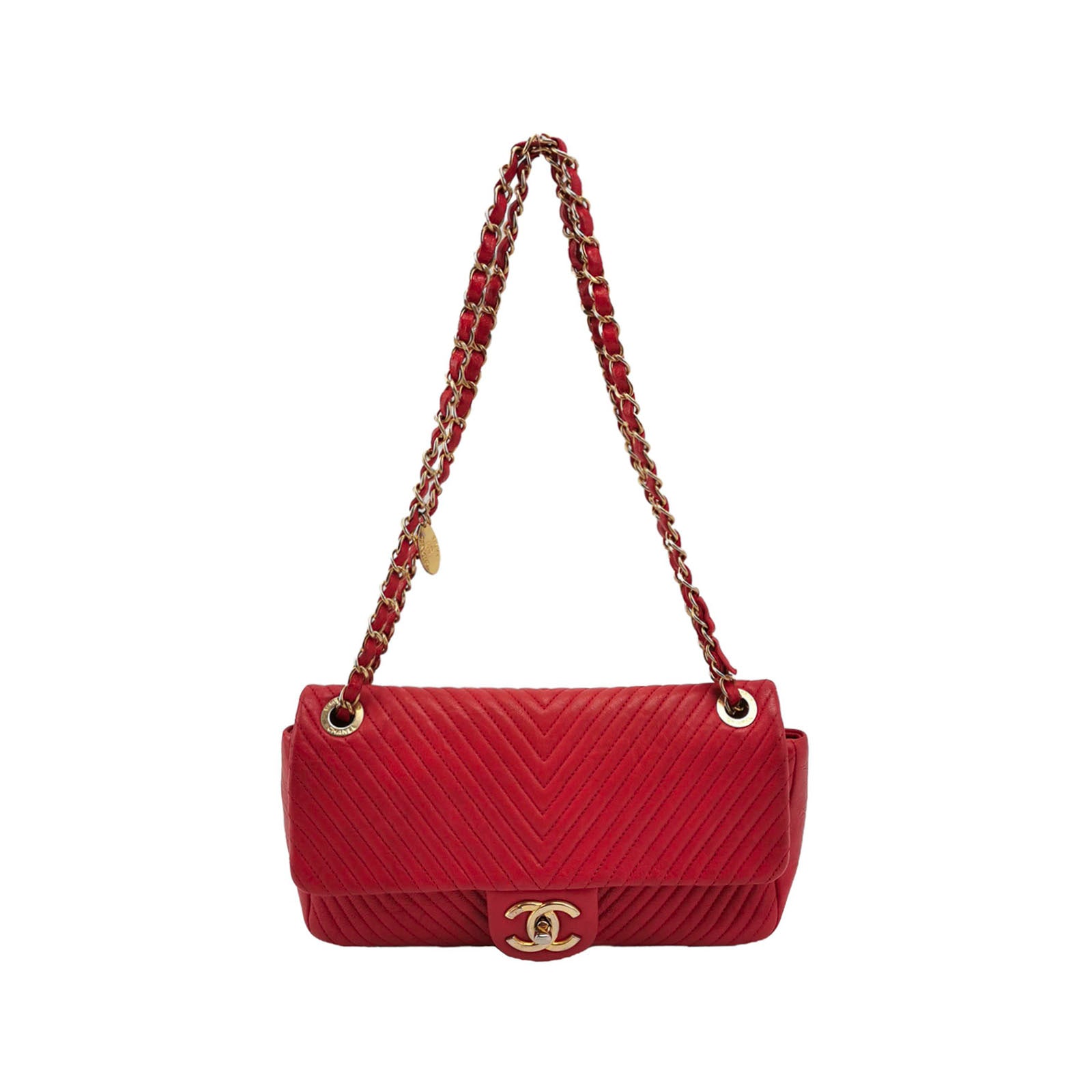 Elevate your style with this luxurious bag that embodies ultimate sophistication. Designed by Chanel, this stunning piece is crafted from red quilted lambskin leather and features a sleek silver-tone CC push lock along with a double chain strap. The Chevron Medium bag opens to reveal a spacious leather-lined interior, complete with a convenient zipper pocket for added functionality.